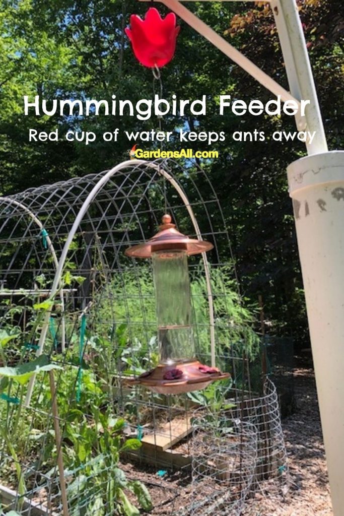 Red cup of water above feeder serves as an ant moat, keeping them out of the feeder.