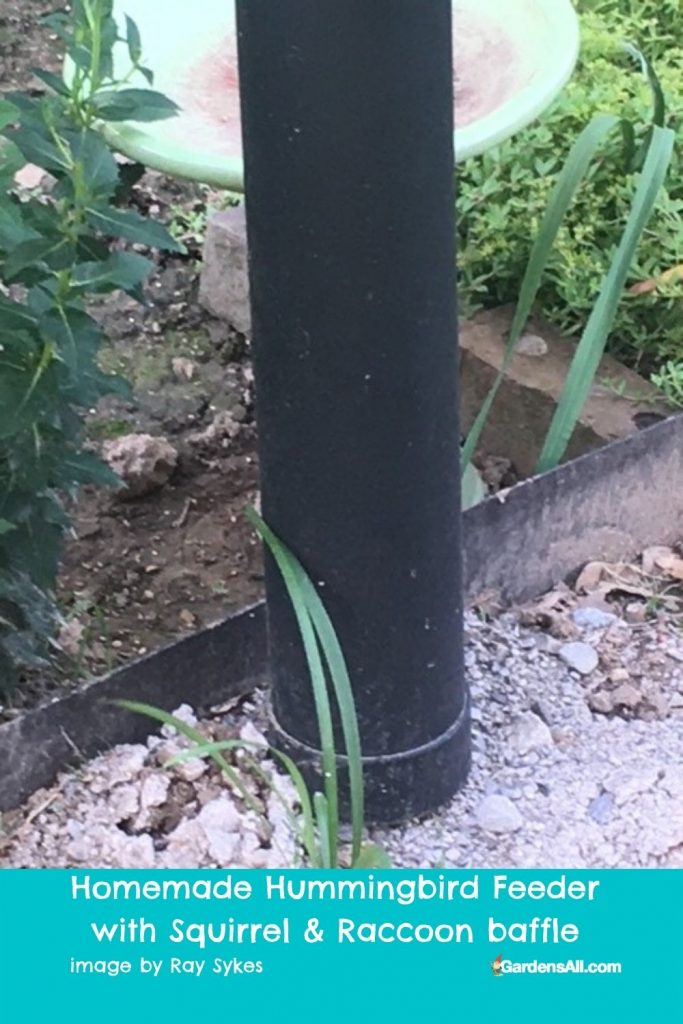 We were delighted to hear from GardensAll reader, Ray Sykes. Not only did the bird feeder baffle work well for Ray, he made an improvement by painting his black and by extending it the full length of the pole!