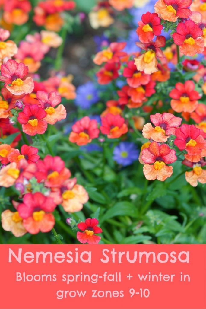We’ve included Nemesia in our flowers that bloom in spring article but adding this one here for those in USDA Grow Zones 9-10 to consider.